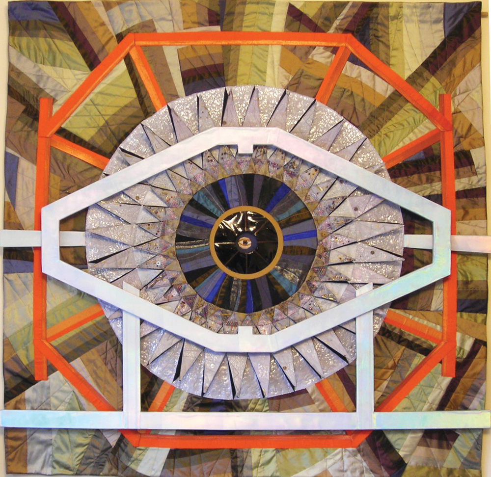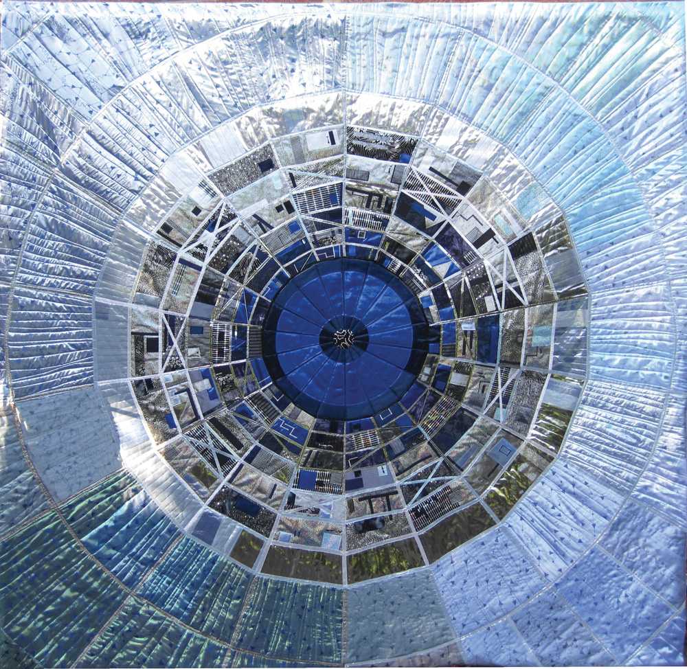 Findlay used traditional patchwork for her three earliest pieces, “Breakthrough,” “Inner Eye,” and “Does the Dark Matter?” Because of the way fabric moves, this technique makes creating circles a fiendish feat. After six to eight weeks of sewing, and down to the final piece, she says, “My heart was absolutely in my mouth.” Until she finished, she had no idea whether everything would line up and lie flat.