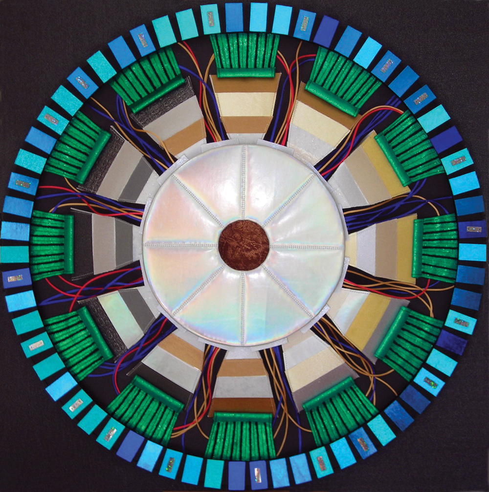 Lately, Findlay has been expanding her topics and techniques. “”I am delving into some of the concepts put forward by physicists about wave particle duality, supersymmetry and string theory,” she says, going on to explain that she bought some fiber optic cable and is experimenting with sewing it into fabric. “There is so much more I could do yet with that subject matter.”