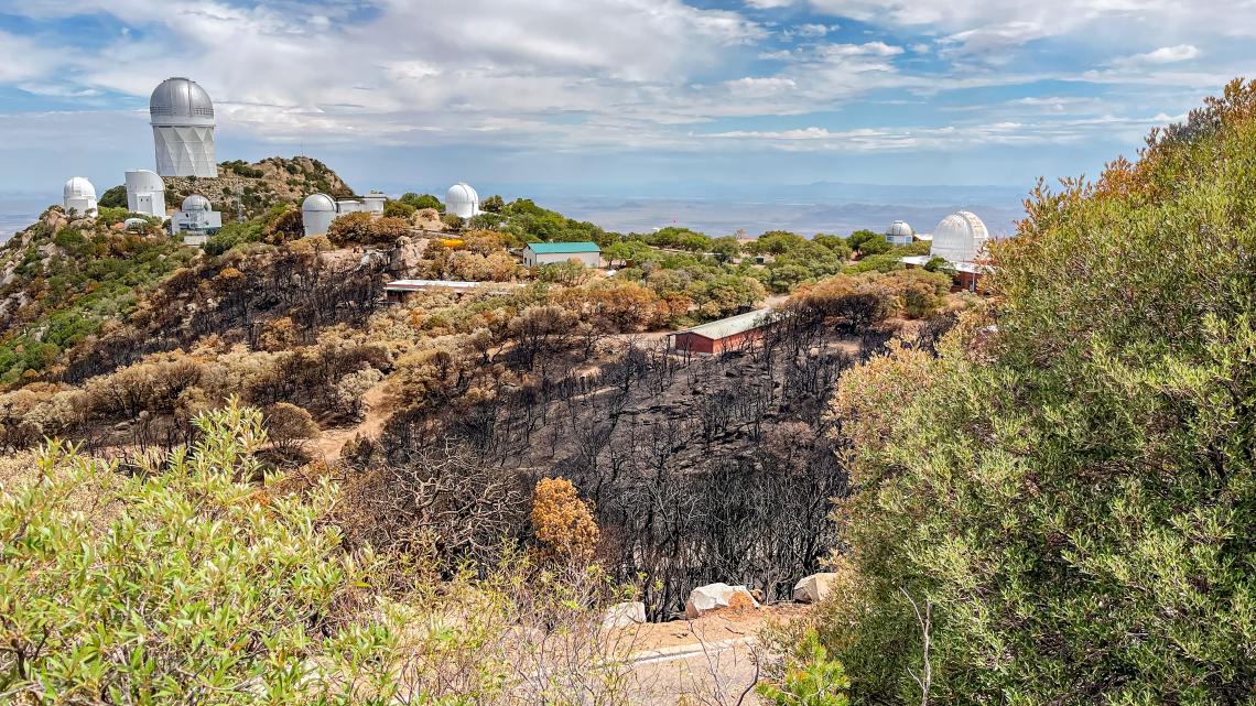 The fire and smoke wrapped around the peak and continued north, burning a total of around 30,000 acres before being contained. At the observatory, four support buildings burned, but all the scientific equipment and telescopes survived.