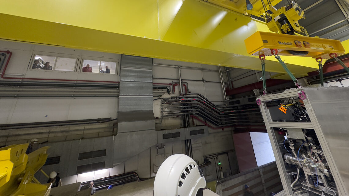 Now, the delicate mission to lift the 850-kilogram box begins. The scientists need two cranes to do the job. “I had a little nightmare last night that the system was swinging when the crane lifted it up,” Leonhardt says. “We were confident from the test last week, but I was still sleepless with the thoughts of worst-case scenarios.”