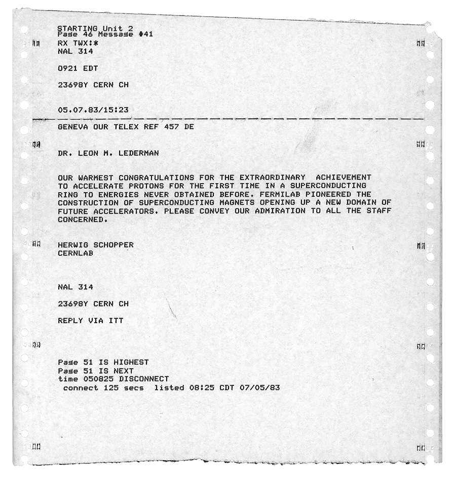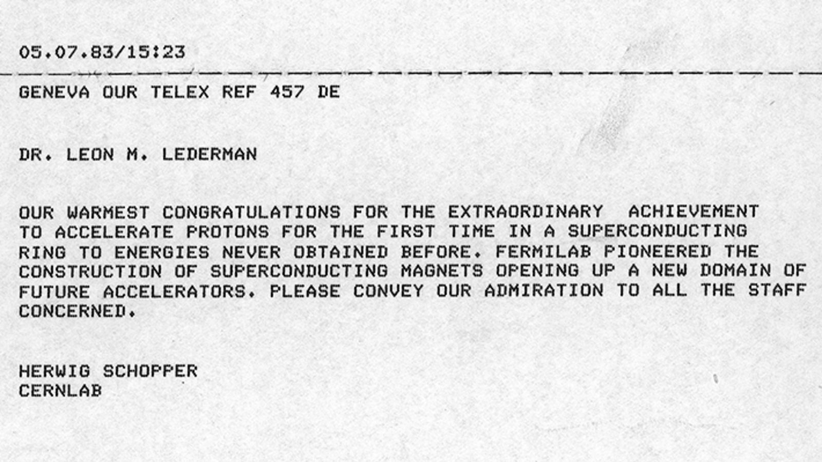 CERN’s director-general Herwig Schopper was one of many dignitaries extending his congratulations to Fermilab director Leon Lederman by telex. Lab directors around the world had awaited news on the Tevatron, the first accelerator to use superconducting magnets to steer a beam of protons around a ring. Featuring more than 1000 magnets cooled to nearly absolute zero temperature, the success of the four-mile-circumference Tevatron accelerator helped to jumpstart other advances in superconducting technology.