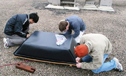 From left: Anfei Li, Ben Nachman, and David Lynch brave the wind and cold to install a weather-resistant cover for a cosmic-ray detector on the roof of their high school in Nebraska.