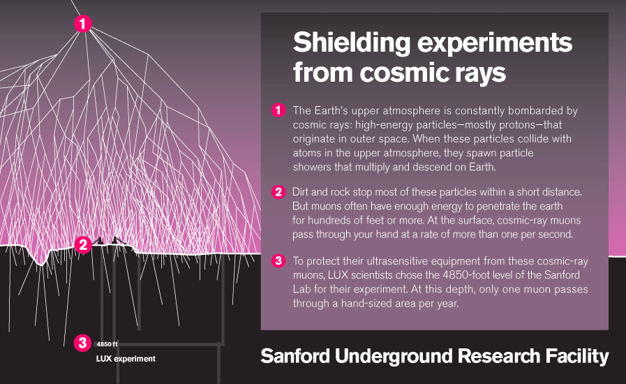 Physicists will install the LUX detector deep underground to protect it from the noise of cosmic radiation. The Earth's upper atmosphere is constantly bombarded by high-energy subatomic particles—mostly protons—that originate in outer space. When these cosmic particles collide with nuclei of oxygen and nitrogen atoms in the atmosphere, they spawn showers of smaller particles. The resulting cosmic din would drown out the faint signals in ultra-sensitive detectors like LUX, if they were on the surface of the Earth. Deep underground, however, the noise abates, and the LUX detector will reside very deep—4850 feet beneath the surface—where cosmic radiation is more than a million times quieter. The water in the tank surrounding the LUX detector will further protect it from extraneous noise, such as naturally occurring radiation from the nearby rock.