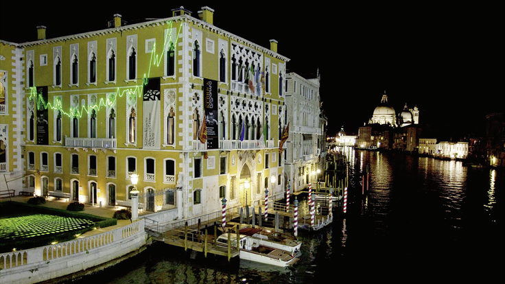 This laser installation on Venice's Palazzo Franchetti was created by German artist Tim Otto Roth. The motion of the green scanning laser is based on observations of distant galaxies by the Hubble Space Telescope