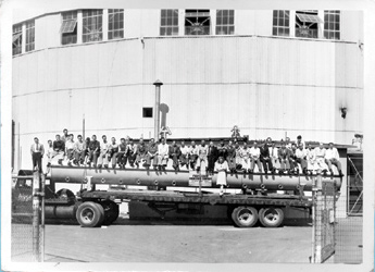 ![]() Berkeley accelerator: Berkeley Laboratory group seated on top of the vacuum tank of their 40-foot 32-MeV proton linear accelerator on the back of a flatbed truck, probably in 1947. Group includes (left to right, back row) Frank Fillmore, Wilfred Kimlinger, Frank Grobelch, Saul Lissauer, Richard Crawford, Clarence Turner, Al Walker, Donald Cone, Arthur Hudgins, Philip Carnahan, Thomas Bristow, James McFaden, Duncan Gardner, Thomas Perkin, Val Ashby, Robert Serber, Pief Panofsky, Chaim Richman, Lauriston Marshall, John Woodyard, Frank Oppenheimer, Morris Jeppson, Alva Davis, Al Chesterman, Luis Alvarez, Richard Shuey, Andrew Gardner, Craig Nunan, unknown, unknown, Don Gow, Edward Day, Selsted, Al Kaehler, Haydn Gordon, David Vance, and (standing in front) Velma Turner. Source: SLAC Archives, ARC100; Lawrence Berkeley Laboratory photo |