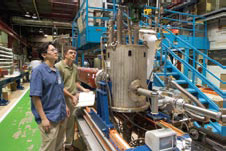 "The Fermilab cafeteria is a wonderful place to talk to people and ask around for available equipment," says Chou, a postdoctoral researcher at the lab. Working the lab grapevine, Chou (left, photo at bottom) and William Wester, a scientist in Fermilab's Particle Physics Division, scrounged enough parts to build their experiment on a shoestring budget. They borrowed a high-powered laser and scavenged a spare Tevatron magnet that could be operated at the existing Fermilab Magnet Test Facility, and kept the cost to about $30,000.