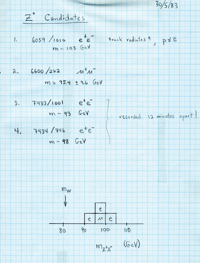 James Rohlf, an assistant professor at Harvard University, was based at CERN and led the analysis of the Z boson signals for UA1. This page from his personal logbook shows the summary of the first four events from UA1 that physicists thought represented the Z. The UA2 collaboration observed the Z soon after.
