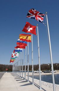 Although flags occasionally get replaced, the usual order is: Argentina, Brazil, Canada, Columbia, France, Germany, Greece, India, Israel, Italy, Japan, Mexico, Netherlands, People's Republic of China, Poland, Russian Federation, South Korea, Spain, Switzerland, and the United Kingdom. They are flown in alphabetical order. Nearby, flags representing the United States, the Department of Energy, and the State of Illinois are on permanent display.