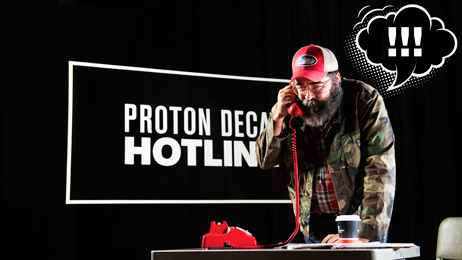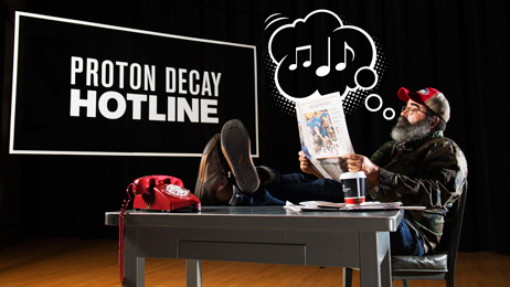 Proton decay hotline, man sits at desk with old red dial phone on desk and musical notes coming out of his mouth