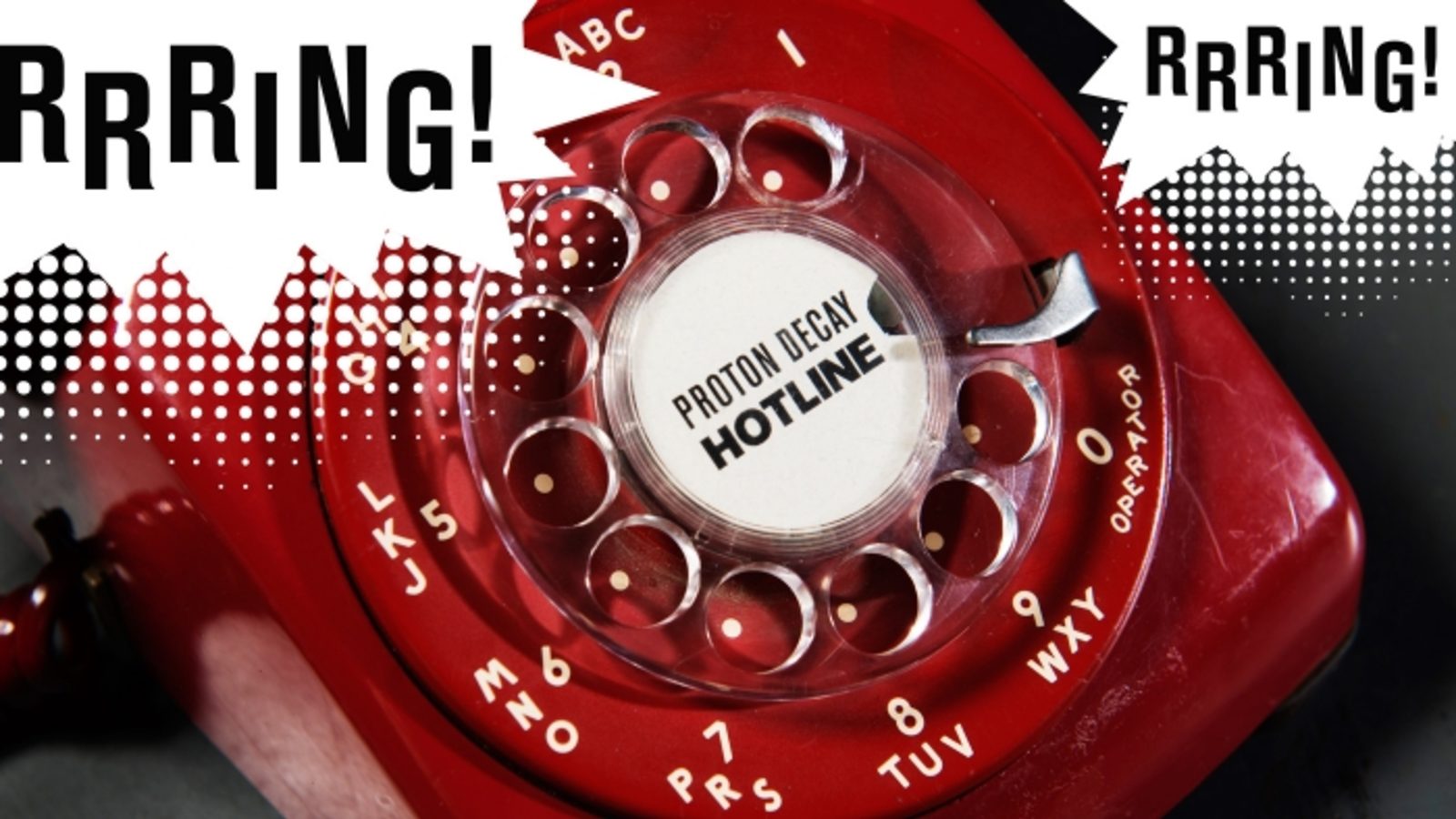 Proton decay hotline, man answering old red dial phone with "!!!"