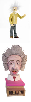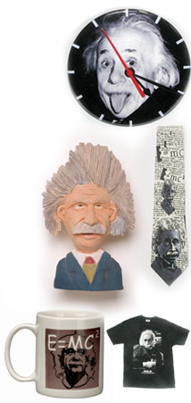 "I Discovered the Theory of Relativity and All I Got Was This Lousy T-Shirt" by Judy Jackson His mug’s on mugs, Bears wear his hair; Albert turns up everywhere. His famed equation greets the eyes From every form of merchandise; T-shirts and ties he doth adorn. Is there Albert Einstein porn? Tots and geezers recognize him; Every market sector buys him. The world, it seems, will never weary Of him and his relativity theory. Year after year, folks take a likin’ To Einstein as a cultural icon. Font of a vast commercial venture, he Made Time magazine’s "Man of the Century." Who’d have thought a patent clerk Would rise above that line of work To symbolize for humankind The greatness of the human mind? That hair, that tongue, that life, that brain– Remind us of all we might attain. Would Albert E. have found it rich To have become the king of kitsch? |