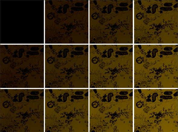 Microbial biofilm on gold crystals found in rocks collected from a South African mine. Researchers are trying to determine whether bacteria, rather than toxic chemicals, can be used to remove dissolved gold from mine waters.