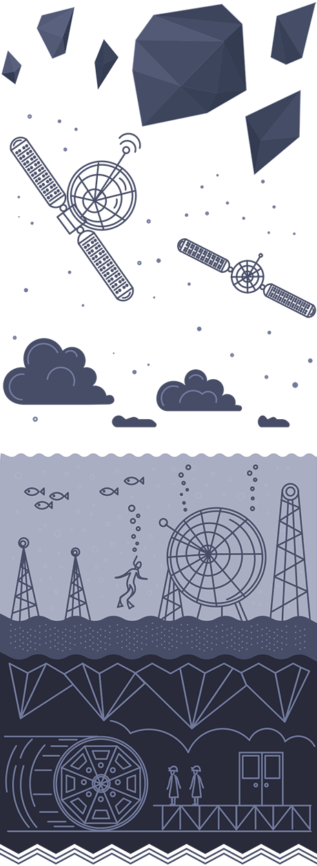 Today, about a dozen direct-detection experiments are snugged into deep caverns in North America, Europe and Asia. They include the Cryogenic Dark Matter Search in Minnesota’s Soudan Underground Laboratory; XENON100, beneath 5000 feet of rock in Italy’s Gran Sasso National Laboratory; the Large Underground Xenon experiment, beneath the Black Hills of South Dakota; and XMASS, taking data in Japan’s Mozumi Mine.