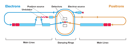 | The light generated by the undulator hits a titanium alloy target, which leads to the emission of positrons. The positrons are accelerated, sent into their own damping ring (orange oval), and made into compact bunches. Then they travel to the start of the main positron linac. From there, they are accelerated to collide with electrons coming from the opposite direction. | |
