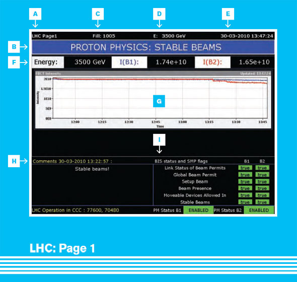 Above this title are three sets of numbers. Fill is an archiving number that increases every time a new beam is injected into the LHC. E is the energy of each beam, 3500 billion electronvolts, or GeV. This is the maximum energy for the LHC’s current run, which will last until late 2011. At top right are the date and local time: March 30, 2010, at 1:47 p.m. Central European Summer Time.