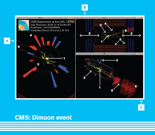 In this case the protons collided at a combined energy of 2.36 electronvolts, or TeV. This is the same collision energy as in the CMS event display, and in fact the two events took place just 16 minutes apart on Dec. 14, 2009, a time when collision energies were being gradually ramped up following a one-year shutdown for repair and refurbishment. This was the highest collision energy that could be safely achieved, given the tests that had been completed at that point.