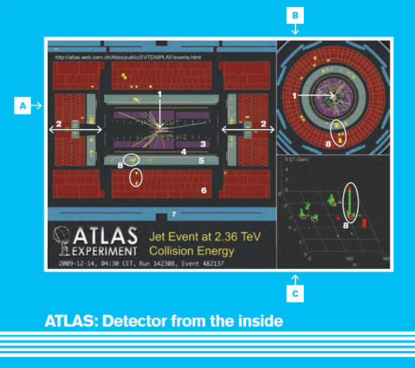 In the next few pages we’ll walk you through displays from the Large Hadron Collider control room and from two of its four major experiments, ATLAS and CMS.