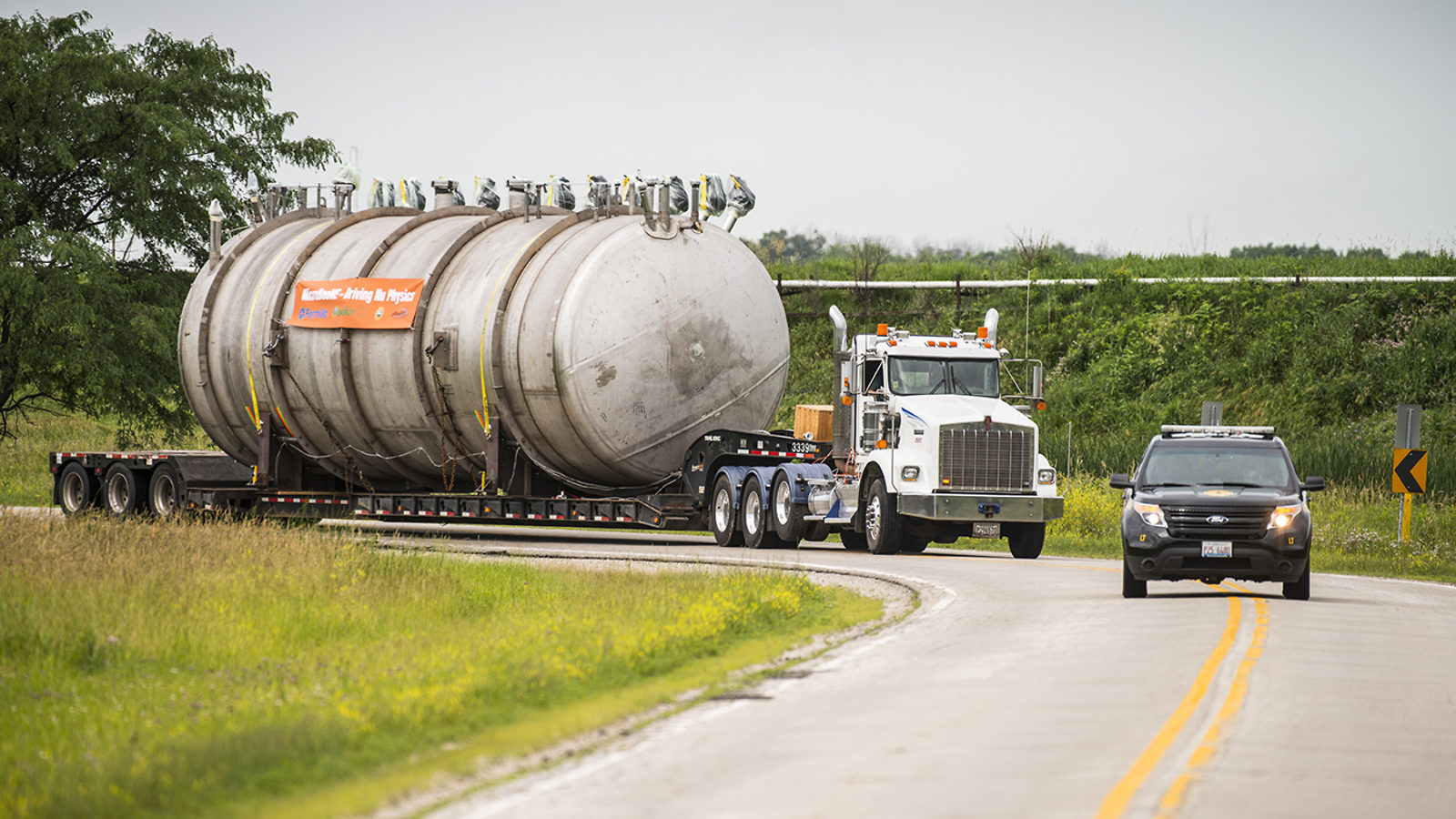 The MicroBooNE detector—a 30-ton, 40-foot-long cylindrical metal tank designed to detect ghostly particles called neutrinos—was carefully transported by truck across the US Department of Energy’s Fermilab site, from the warehouse building it was constructed in to the experimental hall three miles away.