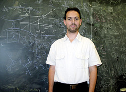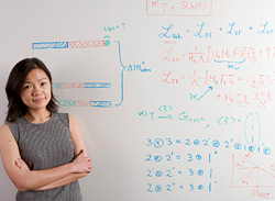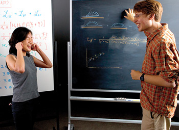 | Theoretical physicists Mu-Chun Chen and Jack Laiho are on opposite sides of the Great Board Divide. Chen, an assistant professor at UC-Irvine, is a recent convert from chalk to marker; Laiho, a postdoc at Fermilab, is a blackboard fan, "because I like the texture of the chalk, and because the chalkboards are easier to erase if you leave them for a long period of time." He adds, "The sound of fingernails on the chalkboard doesnt bother me so much" as it does some people. |