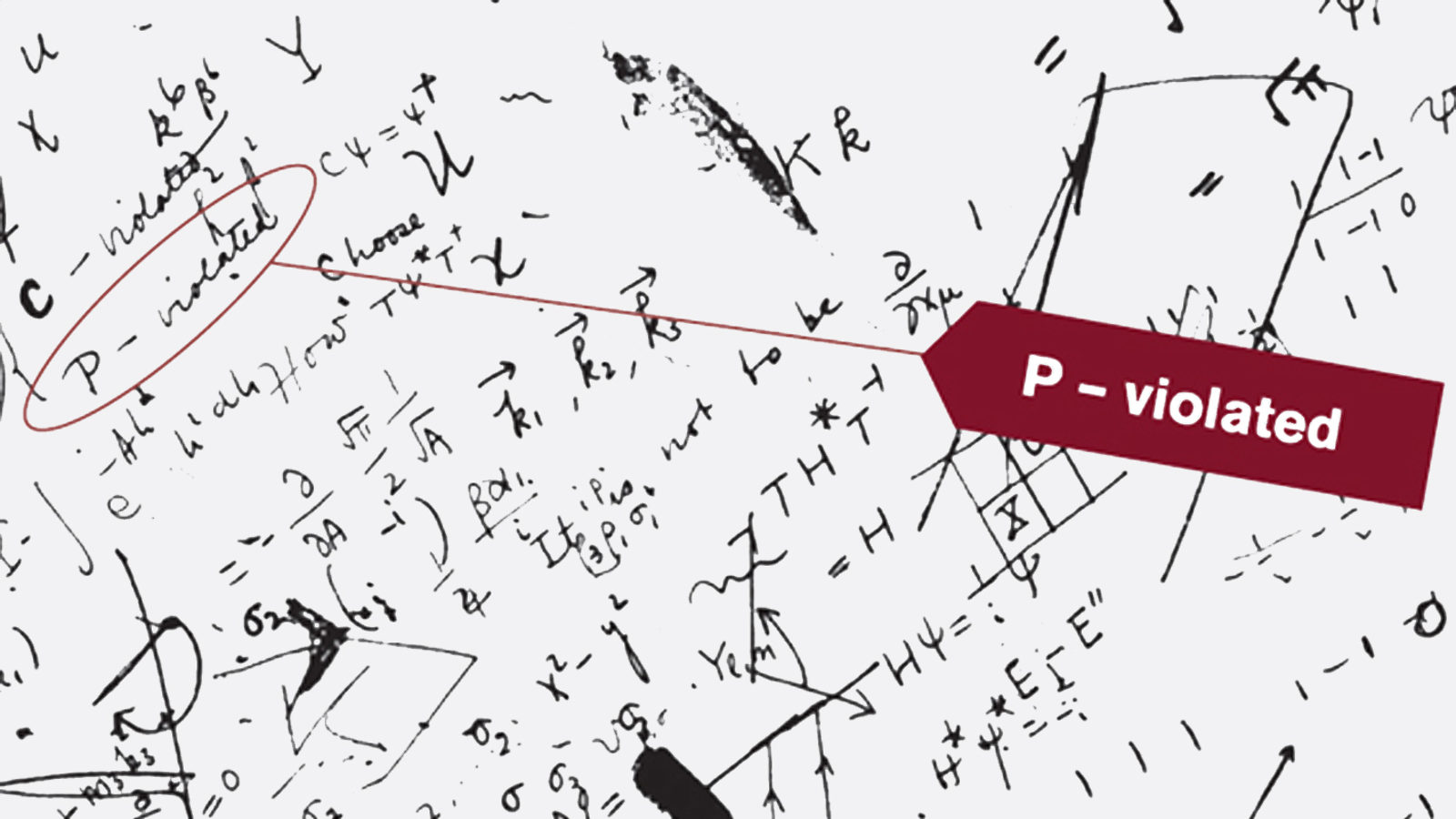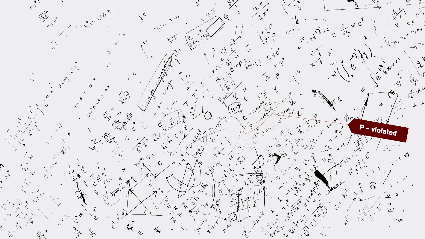 Parity is a type of symmetry encountered in nuclear and particle physics. It is denoted by the symbol "P," scribbled throughout the researchers' note pad. Parity is conserved when the laws of physics for a system of elementary particles remain the same if the positions and directions of all the particles are reversed. Physicists once believed that nature was always symmetrical with respect to such a transformation, making parity conservation a welle-stablished principle in the field.