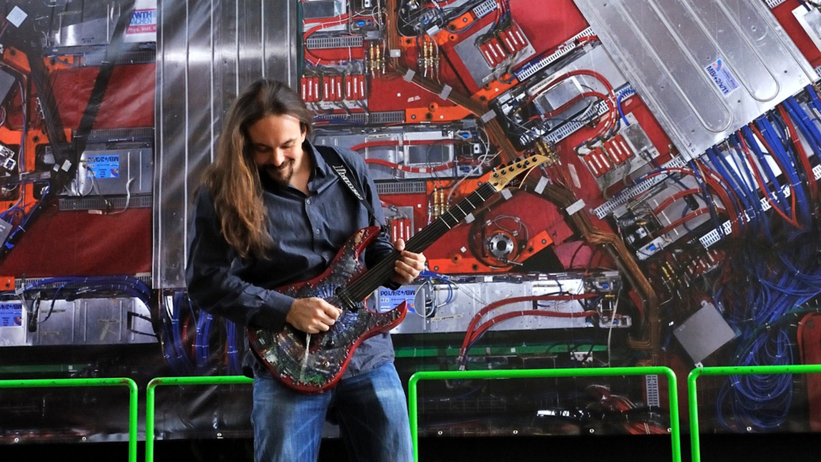 A young man with long hair and with a red electric guitar slung across his shoulder strode across a stage in front of an audience gathered on March 16 at CERN laboratory, located on the border of Switzerland and France.