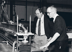 | Former Fermilab physicists Bill Foster (right), now a member of the US House of Representatives, and Gerry Jackson inspect components for a new particle storage ring in 1996. |