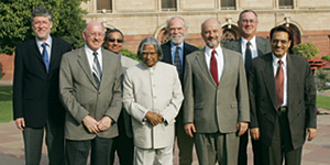 | Delegation visiting the President of India before the Bangalore ILC workshop, from left to right: Albrecht Wagner, DESY; Jonathan Dorfan, SLAC; Shekhar Mishra, Fermilab; President of India Abdul Kalam; Barry Barish, ILC GDE Director; Pier Oddone, Fermilab; Bob Kephart, Fermilab and Ram Shivpuri, University of Delhi. |