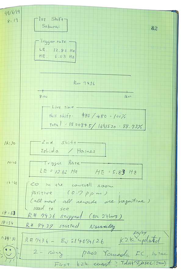 The neutrino experiment K2K (KEK to Kamioka) collaboration shares a logbook with Super-Kamiokande scientists at its far detector site 250 kilometers from KEK in Tsukuba. Taku Ishida and Todd Haines were sitting in the control room of Super-K on the evening of Saturday, June 19, 1999. Taku saw a particle event displayed after it registered in the detector, and he entered his observations in the logbook. The event was also circulated with an automatic email alert, and Yoshitaka Itow was among those to dive into the immediate analysis. Forty-two minutes later, Yoshitaka expressed his feeling that “this is the candidate.” The first muon neutrino event from an accelerator-based long-baseline experiment had been observed.
