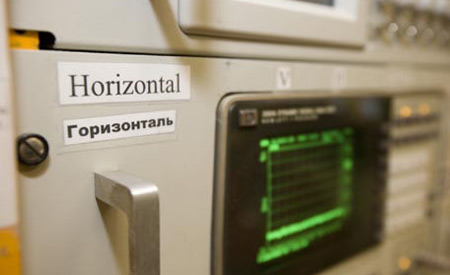 The labels, which mark two crucial monitors displaying the bend of the Tevatron's beamline as it moves through the tunnel, proved amusing—especially to the Russians.