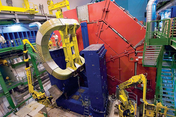 The big savings came from installing the ALICE detector in a cavern previously occupied by another experiment, called L3, and reusing L3's monstrous solenoid magnet. The L3 magnet is bright red, four stories tall and rooted right in the middle of the cavern. The experimenters didn't want to risk damage—plus added time and expense—by taking it apart and moving it aside. So to fit everything in, they'd have to move all the components of their enormous new detector magnet, the muon dipole, up over the top of the red monster and down the other side.