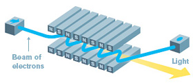 Electrons slalom through the paired magnets of an undulator in a free-electron laser. The back-and-forth motion causes them to emit synchrotron radiation. Unlike the synchrotron light emitted by particles going around a storage ring, the radiation from FELs is coherent, with the crests and the troughs of the light waves lined up; coherence gives it much more intensity. Image: Sandbox Studio |