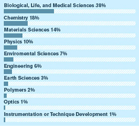 Bristling with beamlinesAt SLACs SSRL and other synchrotron light sources, electrons speeding around a ring emit intense light, usually in the form of X-rays. The light streams out of the ring into beamlines equipped with specialized instruments for conducting a wide variety of experiments. This diagram shows the types of research taking place at each SSRL beamline. The dotted lines show planned future beamlines. Techniques