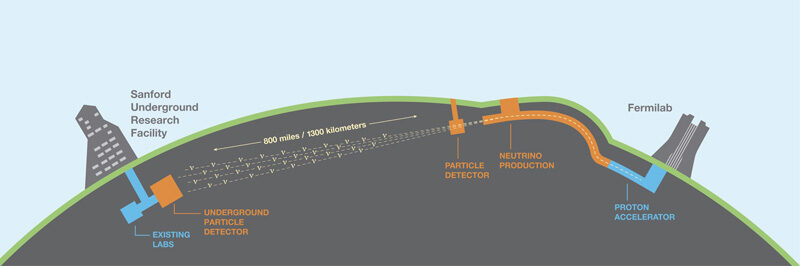 From its place a mile beneath the earth at the Sanford Underground Research Facility in South Dakota, DUNE will investigate the behavior of neutrinos, which are invisible, nearly massless particles that rarely interact with other matter. The neutrinos will come from Fermilab, 800 miles away.