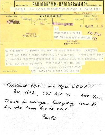 For more than five months, Reines and Cowan collected data and analyzed the results. In June 1956, they sent a telegram to Pauli. It said, “We are happy to inform you that we have definitively detected neutrinos.”