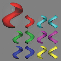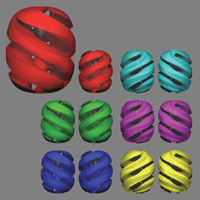 Once Andersen finalized the design of the Standard Model particles, he was able to move on to representing decay patterns and interactions between particles. His Top Quark Event (below, left) is based on actual experimental data from Fermilab. When applied to data in this way, Andersen's work becomes particularly educational: even people without a physics background can look at the event and distinguish the various particles produced by a collision. "It's a far stretch for people to imagine these distances and speeds," Andersen says. "But this highly abstract world is real, and my work makes it visually tangible." Andersen has also used his designs to create a series of three-dimensional sculptures.