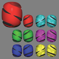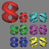 While the modified Lamé curve represents the geometric boundary for all of the particles, each particle's shape varies within the basic structure. Andersen's visual legend explains that "the number of core geometries in the Fermions [matter particles] is based on the generations of quarks (first, second, and third). The difference in mass is indicated by the number of geometric elements and visual 'activity.'" For example, the first-generation up quark (see image top) is represented by a single curve in space, while the charm quark is created by fitting two of those curves together—indicating the charm's identity as a second generation particle. The increased number of components and "visual activity" also indicate that the quarks become heavier as their generation number increases. Quarks that are in the same generation, such as the charm and strange quark, are positive and negative versions of the same space, and particles with opposite spins are represented as mirror images of each other. The colors are based on naming conventions in quantum chromodynamics (the theory of the strong force)—quarks are red, green, and blue, and their anti-colors are represented by cyan, magenta, and yellow, respectively. Leptons, such as electrons and neutrinos, are colorless, both in physics and in Andersen's designs.