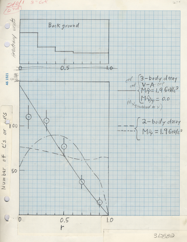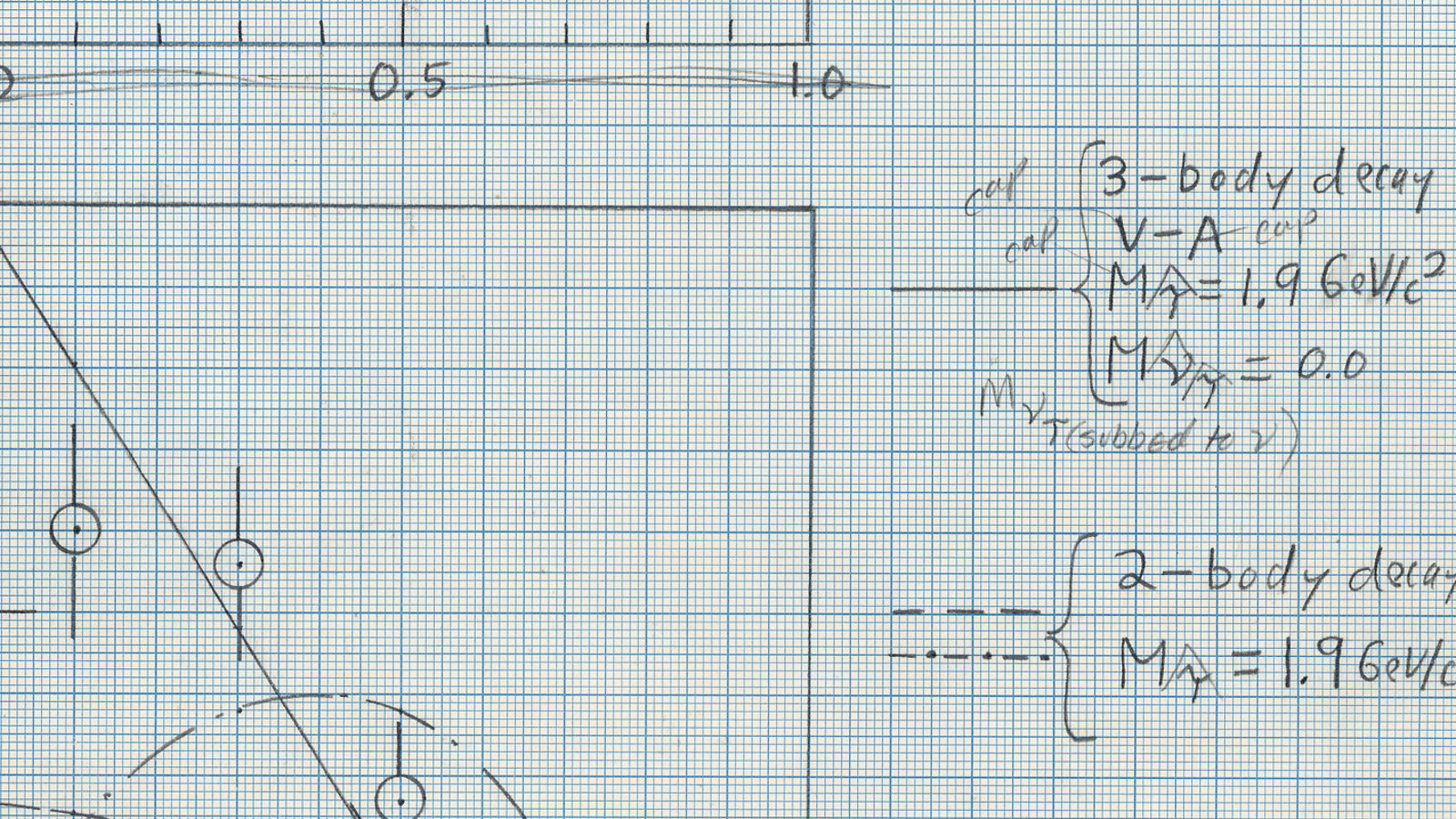 On this page of his logbook, Perl plotted the curves you’d expect for a three-body decay and two different kinds of two-body decays. When he looked at where his data points fell, he was convinced that he’d found what he sought—three-body decay indicating evidence of the tau lepton. Despite the discovery, Perl’s dream is, in some sense, as remote as ever. Why there are three charged leptons, and what determines the ratio of their masses, are questions still to be answered.