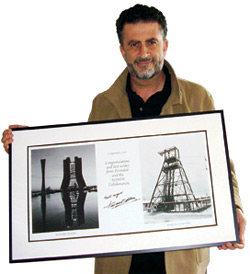 The gift was a framed poster, featuring a picture of Fermilab's Wilson Hall at sunset, mounted next to an image of the mine-head for the Soudan Underground Laboratory in northern Minnesota—representing the beam origin and detector hall for Fermilab's NuMI/MINOS beamline and experiment, covering a similar distance through the earth as the CNGS beam. Fermilab director Pier Oddone had written his congratulations and best wishes (in Italian) across the center, before the framed greeting flew overnight from Chicago to Rome. "We had it all packed up and found out they needed it for some kind of presentation the next day," says Fermilab shipping manager Claudie King. "We put it on the next flight." The greeting arrived on time and was presented to Eugenio Coccia, director of the Laboratori Nazionali del Gran Sasso (photo).