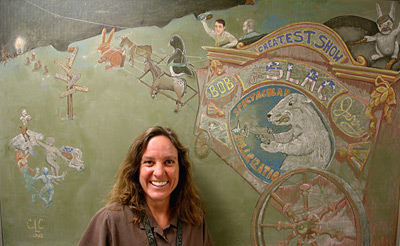 The chalk-and-pastel work remains today. Pictured are project supervisor Bob Kirby and machining supervisor Jerry Collet driving a caravan to the edge of contemporary knowledge, with the magician's rabbit —and SLC Injector project manager—Lowell Klaisner along for the ride. A young woman peeks out of a window below. "I'm running away with the circus, and I'm pretty happy," says Carr.