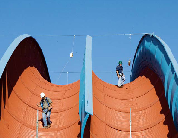 Workers recently took to the roof to patch holes in the steel and fill in cavities. Then they applied an elastomeric coating that hardened in the sunlight to form a flexible sheet. Finally, they restored the building's original blue and orange colors.
