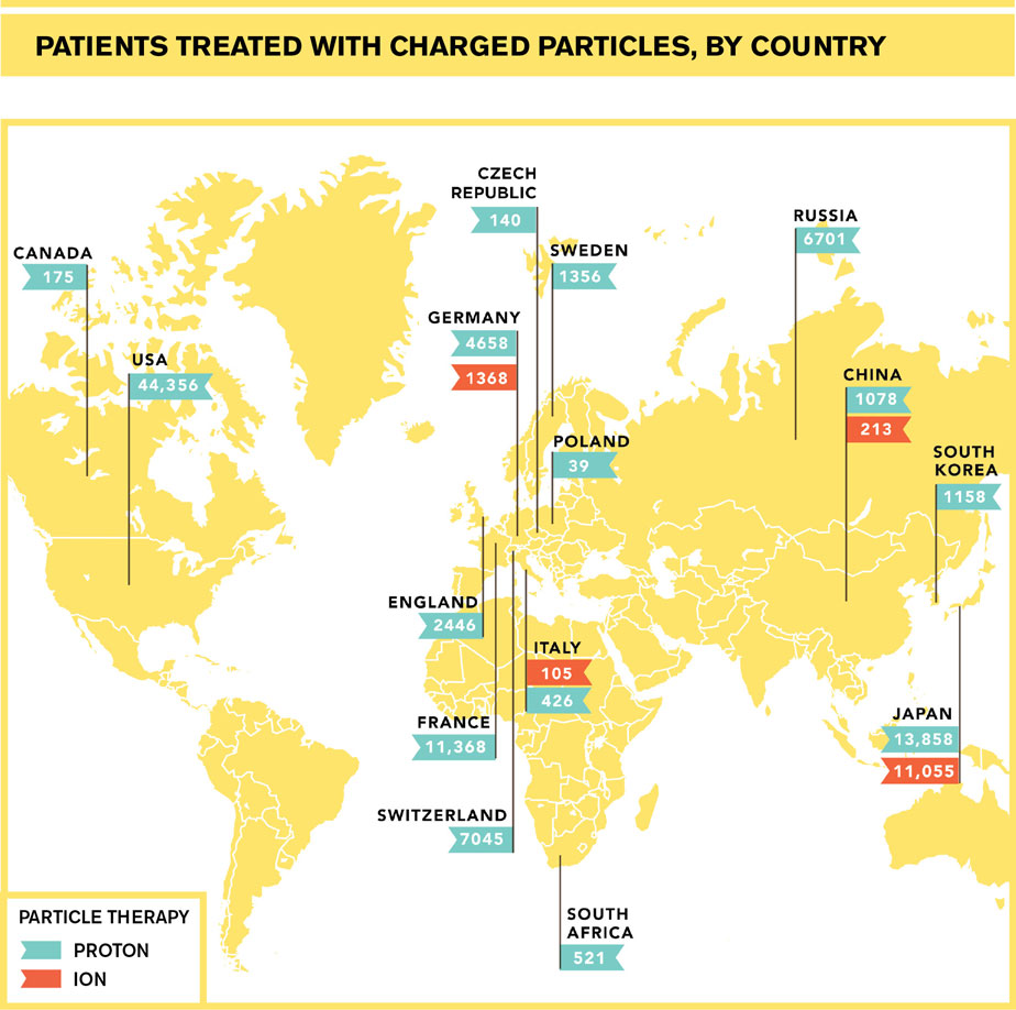 There are 49 charged-particle treatment centers operating worldwide, including 14 in the United States, and 27 more under construction. This map shows the number of patients treated through the end of 2013 in centers that are now in operation. Source: Particle Therapy Co-Operative Group.