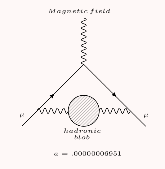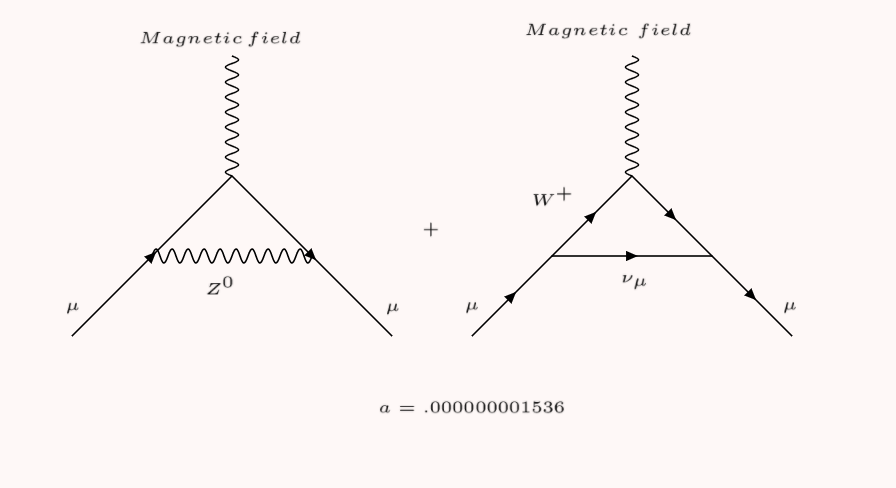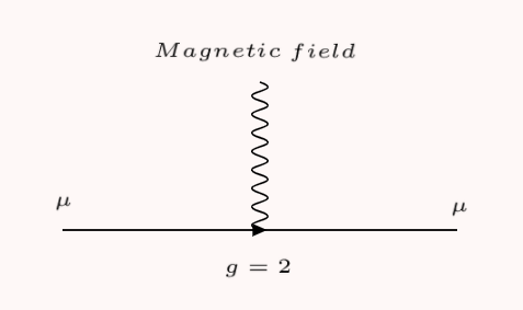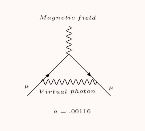 Here, the Feynman diagram represents a muon (the Greek letter mu) moving left to right in a magnetic field (the squiggly line, which also denotes a photon).