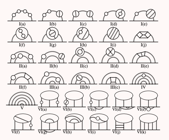 With five virtual photons, there are more than 10,000 possible paths, so there are a corresponding number of Feynman diagrams to calculate. Possibilities abound because virtual photons can split into a virtual electron and a virtual positron (the antimatter counterpart to an electron). This virtual pair can then annihilate back into a virtual photon. Describing these complex paths requires loops and squiggles that arc over each other. Five-photon Feynman diagrams look less like a traditional particle physics schematic and more like abstract art.