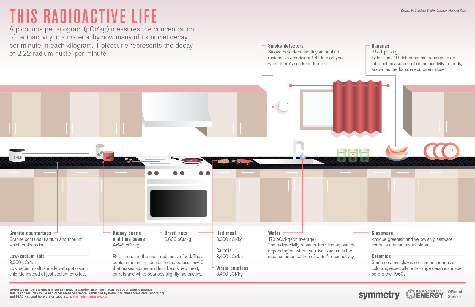 Are there Brazil nuts in your pantry? They’re the most radioactive food there is. A Brazil nut tree’s roots reach far down into the soil to deep underground where there’s more radium, absorb this radioactive element, and pass it on to the nuts. Brazil nuts also contain potassium, which occurs in tandem with potassium-40, a naturally occurring radioactive isotope.