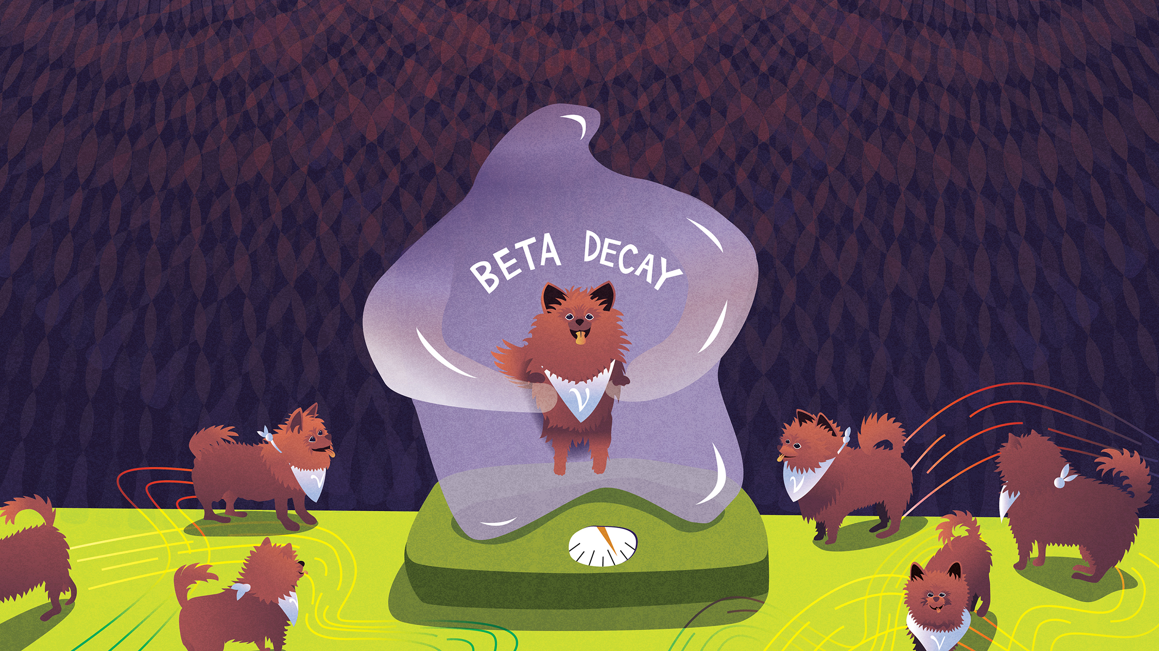 Illustration of A bubble-like blob that says “BETA DECAY” holds a neutrino dog and stands on a bathroom scale