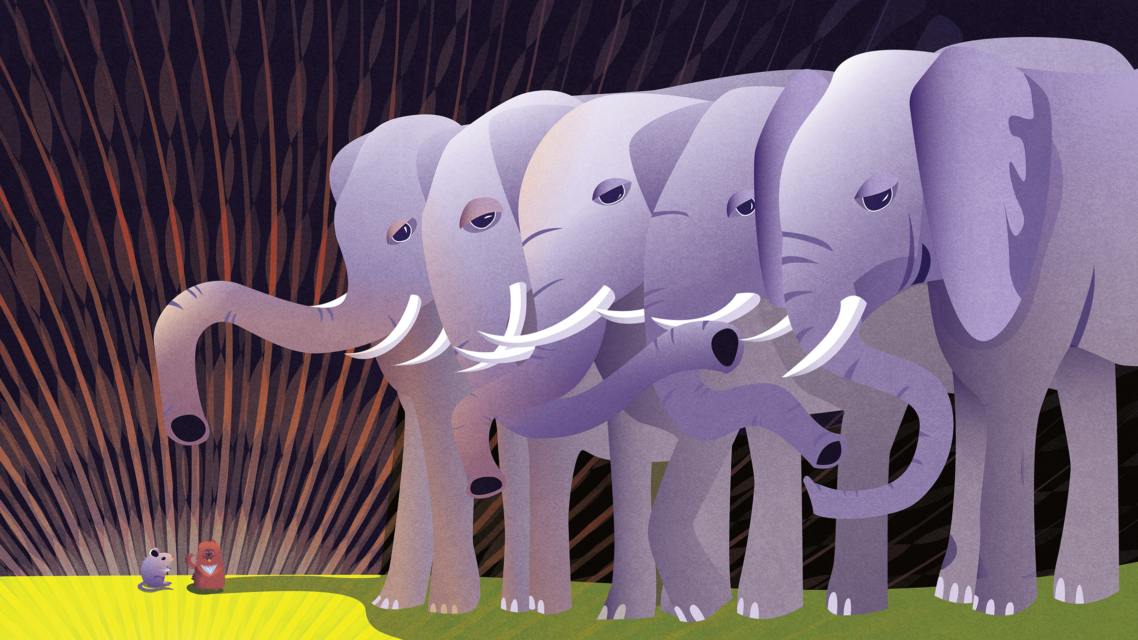 The upper limit for the neutrino mass, as determined indirectly by cosmology, is roughly one millionth the mass of the next lightest particle, the electron. That’s like the gap between one mouse, which weighs roughly 25 grams, and five elephants, which together weigh roughly 25,000 kilograms. “That’s an enormous gap,” says Parno. “It’s awkward to have this empty space in the Standard Model.”