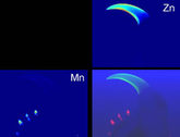 The metals accumulate after molting, as the animals grow into adulthood. Researchers monitored the percentage of metal deposits at different times during development and observed the channels through which the metals migrate into appendages. They found that different metals settle in different areas: zinc is found in the tips of spider fangs while manganese is found in the trunk. Often, metal atoms in the newly hardened structures are also paired with specific non-metals: zinc with chlorine, and manganese with calcium. In the image above, the upper right frame shows X-ray detection of zinc; the lower left shows X-ray detection of manganese. The lower right frame combines the images: zinc is green and manganese is red.