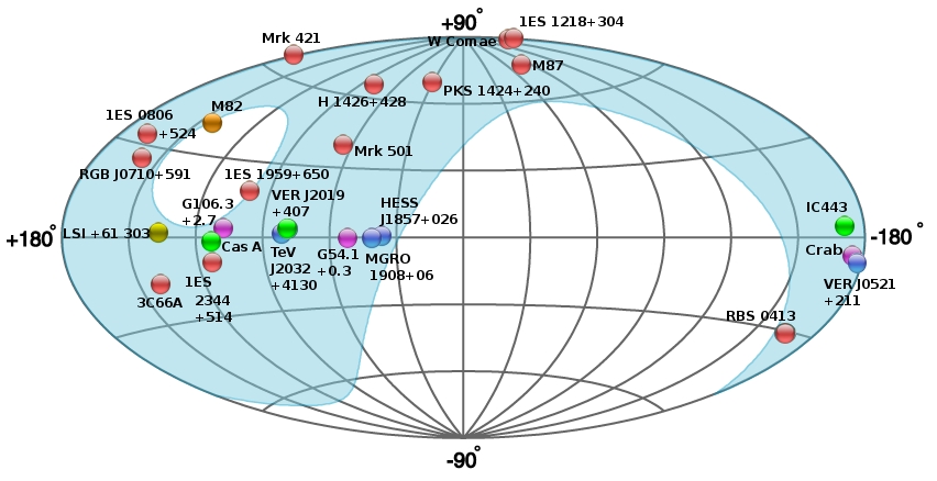 From VERITAS scientist Wystan Benbow: "Here is the VERITAS sky catalog in Galactic Coordinates (i.e. those with the Galactic Plane at the equator). The sky catalog is all objects which VERITAS has seen (& released publicly). The different colors of dots represent different kinds of astrophysical objects. The blue regions are those best visible to VERITAS. Almost all of the marked objects have also been detected by Fermi LAT." Courtesy of VERITAS.
