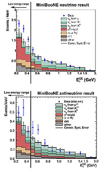 A comparison of the energy spectrum for MiniBooNE electron neutrino (top) and antineutrino (bottom) candidates. The MiniBooNE experiment has found that antineutrinos, which should follow the same rules as neutrinos, might oscillate in a slightly different way. Data is shown in blue points and compared to expected backgrounds. Data is taken with 6.5x1020 (neutrino beam) and 5.7x1020 (antineutrino beam) protons delivered to the MiniBooNE target. Statistical errors are shown on the data points, while systematic uncertainties are plotted on the background.
