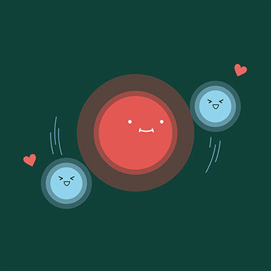 We’re most familiar with the force of gravity, which holds us on the Earth and makes us circle the sun. But at the smallest scales gravity is weak, and particles interact with much stronger forces. There is the strong nuclear force, which holds the nucleus of atoms together; the weak nuclear force, which allows particles to decay; and the electromagnetic force, which holds atoms and molecules together.